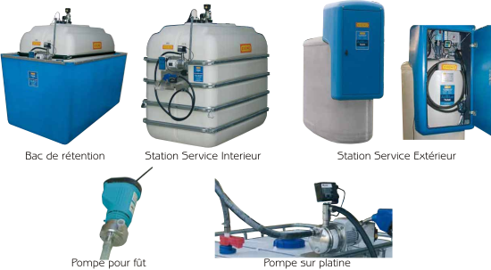 Existe en station-service d’intérieure ou d’extérieure en contenance de 2000, 3000 ou 5000 litres. Débit de 35 L/min. Pistolet vendu séparément. Disponible aussi à la vente pompes électriques pour fût et pompes sur platine pour cuve compatible IBC de marque Mauser ou Schütz.